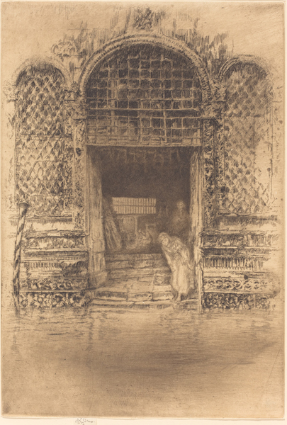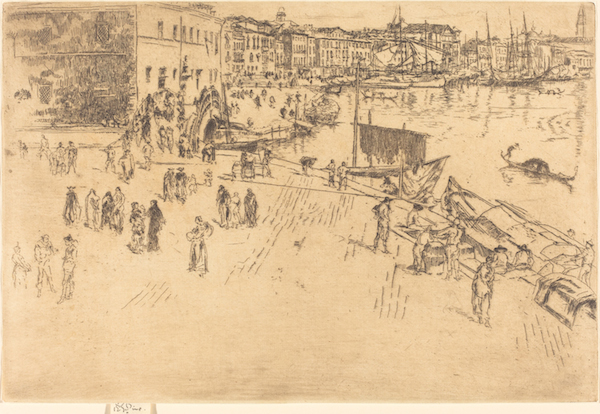 The compositional motifs that had interested Whistler in his previous etchings were archways, doorways, and balconies. In Venice, he found similar enclosures and, of course, bridges. He found many original examples of these deep inside the twisting canals of the city known by many as “La Serenissima.”